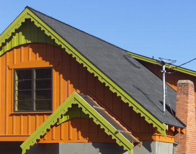 Some cities, and some review boards, get all twitchy about paint color, to the point where some historic commissions have been dubbed "the paint police" by detractors. That overly controlling approach is probably counter-productive. But there's always the bad apple that spoils the basket, and nobody wants to have their neighborhood graced with a Spite Purple house with Upchuck Orange trim either. There is a reason why most people paint within a fairly restrained palette. And it's a good reason, too. Buildings are BIG and a little color goes a long way.